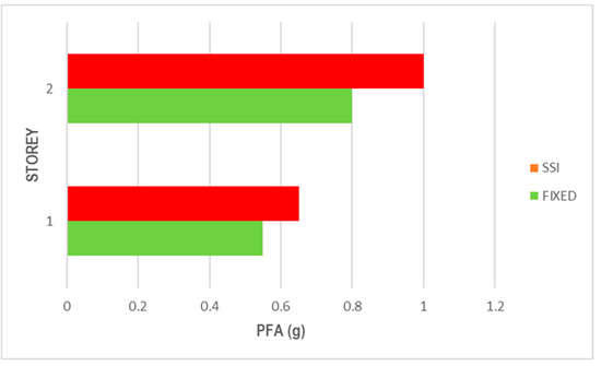 Peak floor acceleration (PFA) of 2-storey frames founded on stiff and compliant soil, respectively.