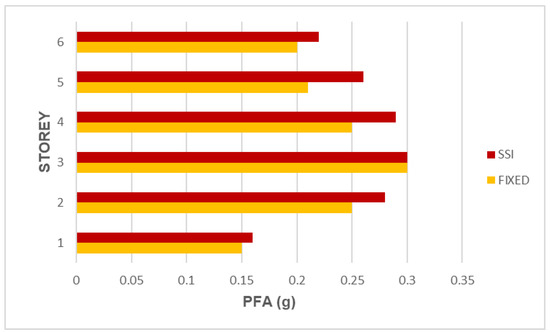 Peak floor acceleration (PFA) of 6-storey frames founded on stiff and compliant soil, respectively.