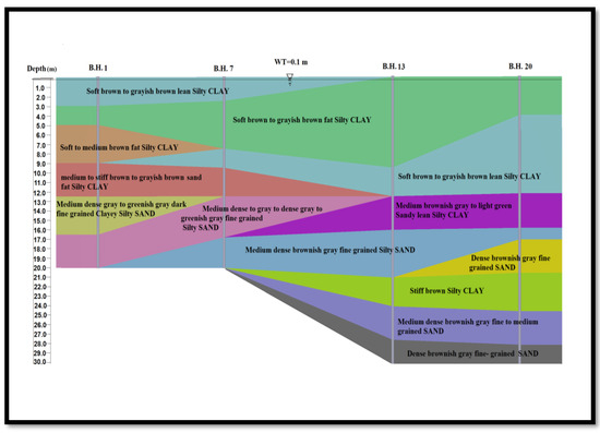 The main data were obtained from various engineering laboratories and geophysical exploration companies, where the data were collected from 69 boreholes drilled at different locations at the intended site at depths between 15 m and 45 m below the natural ground level (NGL), as shown in Figure 2. An example of the cross-sectional profile (for boreholes #1, #7, #13, and #20) of the site is plotted in Figure 3 to illustrate the different soil layers in the longitudinal and horizontal directions. One of the most common issues that geotechnical engineers face is the discontinuity of soil strata in the horizontal direction. On the basis of the results of the site investigation, the subsoils for the whole intended power plant site were mainly soft to medium close to the surface, strengthened with depth, to stiff with grayish and brownish colors; and sandy lean to fat silty clay with shiny spots of soluble salts and crystal pieces of silica minerals, black spots of organic materials together with white tiny marine shells, intervened by and overlying layers of medium-dense to very dense, with grayish and brownish visions in colors, fine- to medium-grained clayey silty sand with rusty spots of iron oxide compounds and black spots of organic matter.