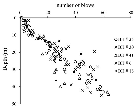 The strength of the soil was measured at several depths via the standard penetration test (SPT). The test was performed in accordance with ASTM D1586-99 [10]. The test involved recording the number of blows of 140 lbs. A standard hammer with a 30-inch (76 cm) drop was used to drive a 2-inch (50.8 mm) diameter standard split spoon sampler into the soil at a distance of 12 inches (30.5 cm). Figure 4 shows the change in the number of blows with depth. The SPT number ranged from 2 to 20 with the soil depth between the ground surface and 15 m below the NGL. The SPT number ranged from 2 to 20, with soil depths ranging from 15 to 25 m below the NGL. Finally, when the depth of the soil increased above 25 m, the SPT values also increased significantly.