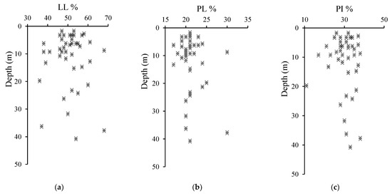 The plasticity properties of the soil at the site are illustrated in Figure 5, where the liquid limit (LL%) ranges between 38% and 68%, the plastic limit (PL%) ranges between 17% and 30%, and the plasticity index (PI%) ranges between 11% and 33.8%.