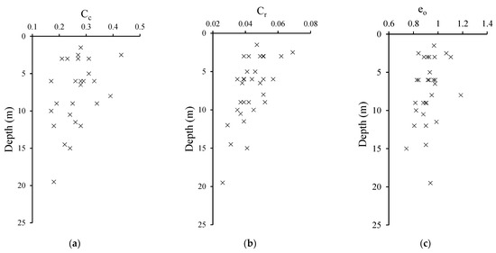 (a) Changes in the compression index, (b) compression index, and (c) initial void ratio with soil depth.