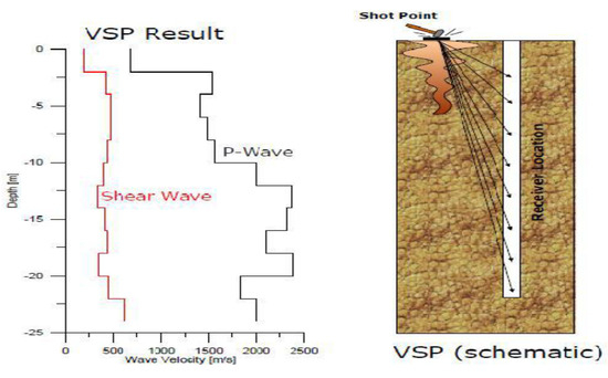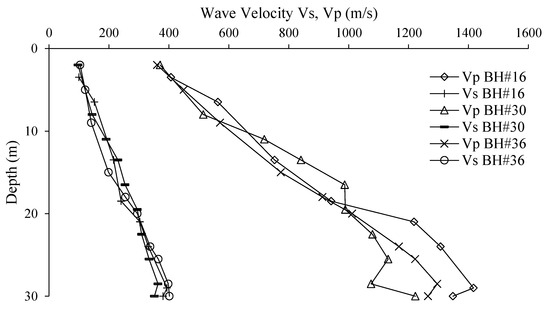 A seismic survey was carried out via the downhole method at three boreholes (boreholes #16, #30, and #38) at the site to a depth of 30 m from the NGL. The seismic parameters of the soil were calculated, and the results are shown in Table 5.
