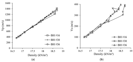 The minimum and maximum values of the recorded shear and compressional wave velocities were (Vs)min,max (97–402) m/s and (Vp)min,max (361–1417) m/s, respectively. In addition, the shear and compressional wave velocities against depth for each borehole from the downhole test are shown in Figure 8. It is clear that Vs and Vp increase with depth in proportion to the bulk density, γ, which also increases with depth. Figure 9 shows that the denser the soil layers, the greater the wave velocity. This relationship was discussed by Gaviglio [12], Yasar and Erdogan [13], and Chawre [14].