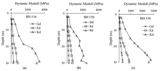 The dynamic moduli with soil depth: (a) Gd, (b) Ed, and (c) Kd.