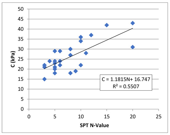 In this section, a number of soil property correlations were predicted via statistical analysis. The physical soil properties, which are illustrated in Table 2, were analyzed for different boreholes. Figure 11 shows the correlation between SPT (N value) and cohesion C (kPa) for the available data. Simple regression analysis was performed via Microsoft Excel software (2013). The correlation equation was (C = 1.1815 N + 16.747), with a coefficient of correlation of R2 = 0.5507.