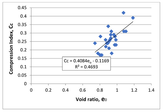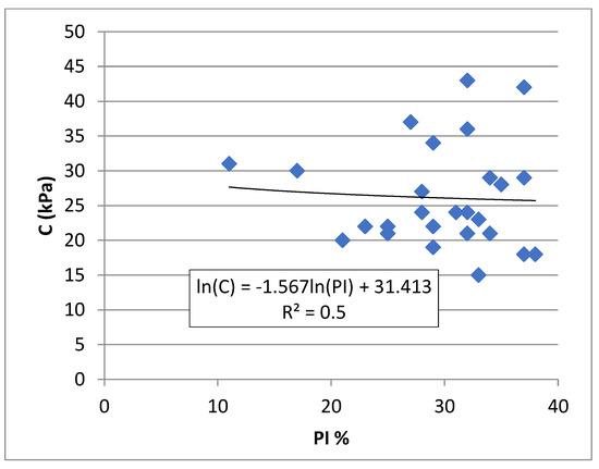 The cohesion of the soil, which was evaluated via different laboratory tests, was analyzed with respect to the plasticity index (PI %), and the evaluated statistical equations were (ln(C) = −1.567ln(PI) + 31.413) and (R2 = 0.5), as shown in Figure 12. Figure 13 shows the consolidation parameter compression index (Cc) against the void ratio (e0). The resulting equation from the regression analysis is (Cc = 0.4084e° − 0.1169), with (R2 = 0.4693). These correlations are considered medium to good depending on the coefficient of correlation R2.
