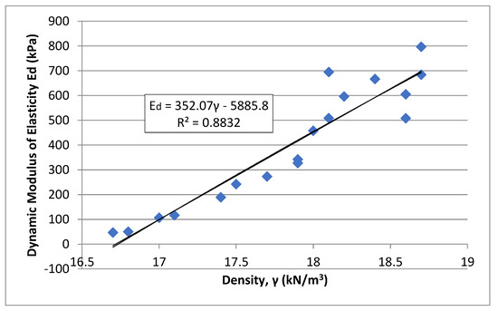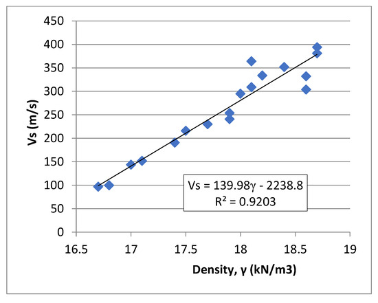 The dynamic parameter correlations were examined and analyzed statistically via Microsoft Excel regression analysis. Figure 14, Figure 15 and Figure 16 present the correlations between the density and the dynamic modulus of elasticity, compression velocity, and shear wave velocity, respectively. The results were valid and provided excellent relationships through the value of the coefficient of correlation R2. An R2 value closer to 1 for linear regression analysis means that the data are perfectly correlated.