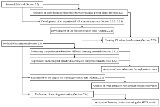 Figure 3 shows the flowchart of this study. In the research methodology Section 2.2, we first explain the overview of the periodic inspection of nuclear power plants and the selection of the target work (Section 2.2.1). Next, we describe the detailed functions and features of the development of the experience-based VR education system (Section 2.2.2 and 2.2.3). Then, we describe the development of a support tool for creating content that operates within the VR education system (Section 2.2.4). Finally, we describe the content of the VR education content that allows the participants to experience the selected periodic inspection work (Section 2.2.5).