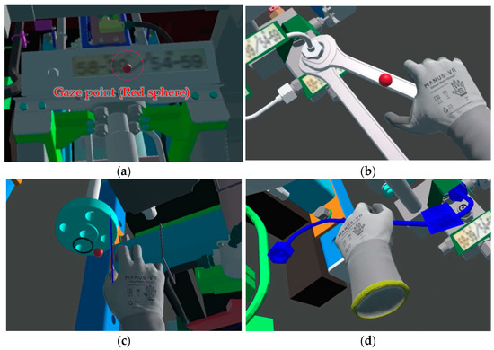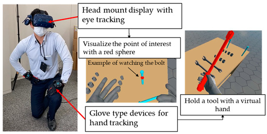 An example of a subject experiencing an experiential VR system is shown in Figure 6. Eye tracking was used to detect eye movements, and gazing points in the VR space were represented by red spheres to visualize eye movements. In the figure, the user is gazing at the bolt, and the red sphere is displayed. The gaze movement was reproduced by judging the completion of the gaze movement when the red sphere was detected to stay on an object for a certain period of time.