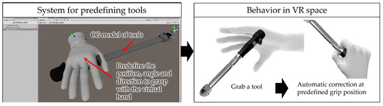 Therefore, we developed a plug-in tool in Unity to assist the user in defining the tool holding points, angles, and orientations in advance (Figure 7). First, a CG model of the tool is prepared, and a virtual hand object is placed and stored so that the tool is held in the appropriate position, direction, and angle. This predefinition is performed for both the right and left hands. In this way, if a tool is not held properly in the actual VR space, it can be automatically corrected to the predefined state. The same tool can be used for different purposes by providing two different ways of holding it, by defining forward and reverse hands, respectively.