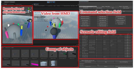 As mentioned above, when using VR to reproduce work training for a large-scale plant, it is necessary to reproduce the work procedures for a huge amount of equipment and parts, which requires a great deal of time and effort to create the content. To solve this problem, we developed a tool for creating VR content easily and efficiently without programming as a plug-in for Unity. The screen of the developed content creation support tool is shown in Figure 8. In this system, each action in the VR space is made into commands, which can be combined in any order to freely create VR scenarios. The content creation support tool allows users to freely create VR scenarios by selecting the command they wish to operate from the command selection field, then selecting the object they wish to control with that command from the object group, and finally entering the various attribute information required for that command. The commands to be selected were developed specifically to reproduce the work behavior that is characteristic of the inspection work. The commands are designed to reproduce the user’s actions, such as visual confirmation by eye tracking, object control by hand tracking, installation and removal of parts, replacement of consumable parts, application of lubricant, and lifting of heavy objects by crane or chain block, as well as to support learning by displaying work procedures and presenting knowledge (images, video, audio, and text). This tool enables the efficient and quick creation of VR content for complex special operations in large-scale plants.