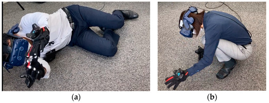 As shown in Figure 9 and Figure 10, the VR teaching materials are interactive learning contents that can be experienced by moving the body in the same position as the actual work using eye tracking and hand tracking. Since the content was created with an emphasis on providing an immersive experience, it does not display all the textual information presented in the paper and video materials but allows the user to learn the information necessary for the evaluation of this experiment through the display of text, images, and narration as the content progresses. The duration of the experience varied depending on the behavior of the participants but ranged from 40–60 min. The learning time for all materials was one hour. The paper and video materials could be studied as many times as needed, but the VR materials could only be studied once due to the time required for the experience.