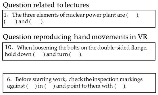The test consisted of 60 questions, 18 of which were lecture-related questions to acquire basic knowledge and 42 of which were reproduced in VR. Of these, 35 questions reproduced movements using the hands, and seven questions reproduced movements using the eyes. Excerpts from the examination questions are shown in Figure 11, and all the test questions are given in Appendix A.