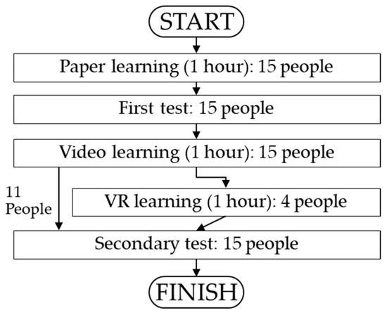 First, all the subjects studied on paper for one hour and took the first test. Next, all the participants studied the video material for one hour, of which 11 took the second test. The remaining four participants took the second test after studying the VR material for one hour; the questions for the first and second tests were the same, but the order of the questions and the order of the choices were randomly changed. Because this experiment was conducted with new employees who had the same knowledge and experience level, the score correction used in the experiment was not performed.