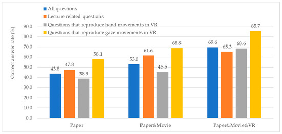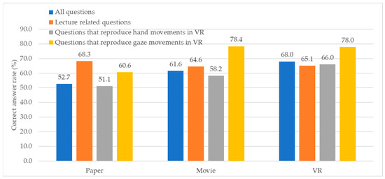 For example, Q1 asks for basic knowledge of nuclear power plants. It is classified as a “class-related question” because the subject only sees the material displayed in all the teaching materials (paper, video, and VR) and does not reproduce it in relation to their actions in the VR space. Q10 is a question on loosening a bolt on a flange; since the subject holds the wrench by hand, attaches the bolt to the nut, and turns the nut side in the VR space, it was classified as “a question reproduced in VR that reproduces hand actions”. Q6 is a question in which the subject matches the individual number of the HCU to be inspected prior to the work with the nameplate. Since the subject aligns the gazing point visualized using eye tracking with the nameplate, it was categorized as “among the questions reproduced by VR, the question reproduced eye movement”.