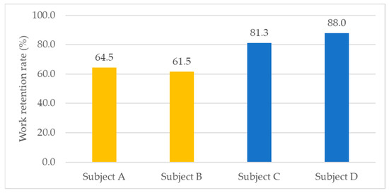 Since the subjects’ age, experience in the field, and years of employment varied, their latent basic knowledge differed, so the scores were corrected by weighting the individuals’ abilities (proficiency) in reference to the methods used in previous studies. According to the literature [44,45], the initial achievement level of unskilled workers is assumed to be 60%, and skilled workers are assumed to have 1.7 times the work efficiency of unskilled workers. The subject’s skill evaluation (understanding of the operation of tools and machines used in the work and the workflow) was evaluated at six levels, 5% each, in the range of 100%–130%. The subject’s independence evaluation (breadth of vision and management ability to see the entire work, including intellectual ability, memory ability, and communication ability) was evaluated at six levels, 5% each, in the range of 100%–130%. Multiplying the skill evaluation by the independence evaluation resulted in a work efficiency rating of 169% for the most skilled workers, which is almost equal to the 1.7-fold rating. This method was also applied in the subjects in the experiment of this study, and the evaluation values were objectively calculated and weighted by considering the age, years of employment, years of experience in the field, and other factors for each subject.