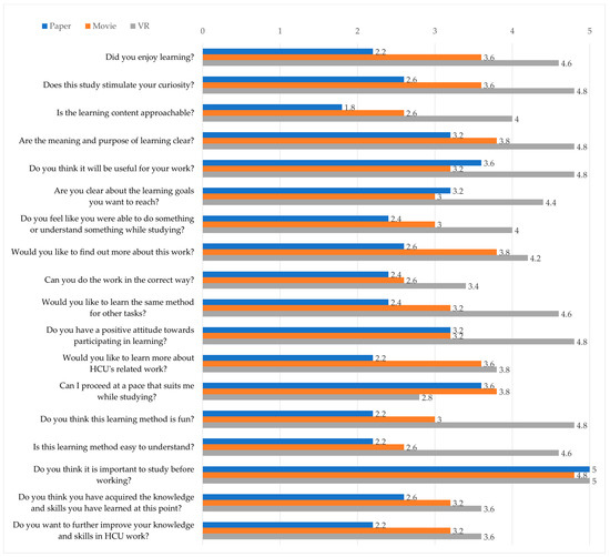 As shown in the experimental results, the paper-based learning materials were advantageous in terms of the acquisition of basic knowledge, repetition of learning, and learning opportunities and frequency, but had disadvantages in terms of comprehension, retention rate, and motivation to learn. The video materials were effective in terms of work procedure comprehension and learning opportunities and frequency, and covered the demerits of paper materials, but had some demerits in terms of the acquisition of basic knowledge and the repetition of learning. For the VR materials, while covering the respective disadvantages of paper and video, the scores were generally high for each feature, but there were disadvantages in the acquisition of basic knowledge. There were also disadvantages in terms of the cost of equipment and content production. However, the total average score was high at 3.7.