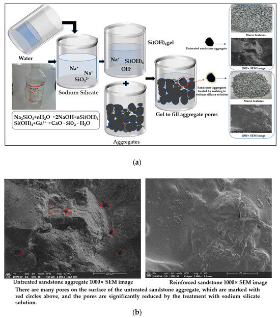 The strengthening mechanism and macro-micro comparison. (a) Sodium silicate treatment process; (b) SEM image of sandstone aggregate before and after treatment.