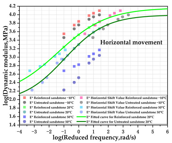 As illustrated in Figure 5, the sigma formula exhibits remarkable consistency across a range of temperatures, with the kinetic modulus displaying a smooth, linear trajectory. The class ‘S’ curve, with an R2 value of 0.99, provides strong evidence that the main curve of the kinetic modulus aligns with the theoretical framework of linear viscoelasticity. It can be observed that as the frequency increases, the growth rate of the dynamic modulus initially rises and then falls. The dynamic modulus of the reinforced sandstone is greater than that of the untreated material, indicating that the improvement in the dynamic modulus achieved through aggregate treatment is consistent with the desired outcome. The treatment of aggregates effectively enhances the modulus of asphalt mixtures. Although the theoretical maximum value of the dynamic modulus can be obtained due to the S-curve property, this was not confirmed in the actual experiment due to the many difficult-to-control factors affecting the dynamic modulus, such as the void ratio and mineral gap ratio.