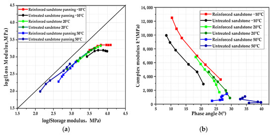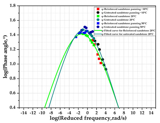 As illustrated in Figure 6, the primary curve of the phase angle exhibits a conventional bell shape. The phase angle aligns closely with this curve at medium and low temperatures, where the R2 value for the reinforced sandstone is 0.99. The R2 value for the untreated sandstone is 0.98. This indicates that the Kramers–Kronig (K–K) relationship effectively represents changes in the phase angle of the mixture. However, the trend of the phase angle becomes more complicated at high temperatures, as evidenced by the fact that the phase angle does not vary monotonically with increasing frequency, which is inconsistent with the linear viscoelastic behavior of the mixtures and may be related to the transition from viscoelastic to elastic behavior [22]. As the frequency increases, the phase angle rises to a peak and then decreases. This behavior is mainly observed at very low frequencies, where the mixture exhibits viscous properties. The increase in viscosity leads to greater delay, which corresponds to an increase in stress delay. When the frequency approaches approximately 0.08 rad/s, a peak is reached, followed by a decrease, possibly indicating a change in the material’s behavior. Consequently, permanent deformation is more likely at high temperatures and low frequencies. The frequency at which the highest phase angle value for the reinforced sandstone occurs and the overall trend are lower than those for untreated sandstone. This suggests that the elastic component and hysteresis delay of the reinforced sandstone are greater and lower, respectively, compared to untreated sandstone.