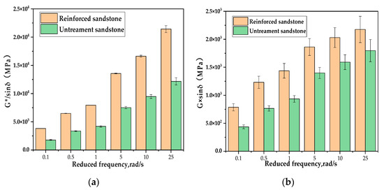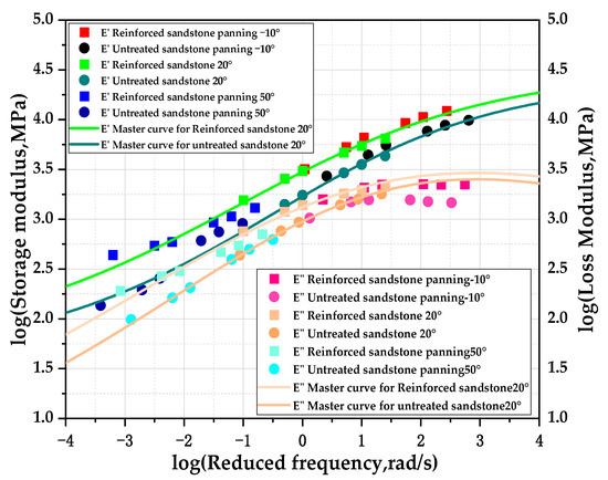 As illustrated in Figure 7, the storage modulus master curve exhibits an S-shaped profile similar to that of the dynamic modulus master curve. The loss modulus curve displays a bell-shaped profile, analogous to the phase angle [18]. The R2 value for the reinforced sandstone is 0.98. It is noteworthy that when related to the phase angle, storage modulus, and loss modulus master curves—the R2 value for the dynamic modulus fitted to the master curve is reduced. However, reading the parameters improves the accuracy. At any frequency, the storage modulus is greater than the loss modulus, indicating that the mix is predominantly elastic. The storage modulus is higher at high frequencies and low temperatures, suggesting that the mix can store more energy and exhibit greater elasticity. Conversely, at high temperatures and low frequencies, increased friction between the aggregates results in higher viscosity, which raises the loss modulus and lowers the storage modulus [20]. The storage modulus and loss modulus of reinforced sandstone are greater than those of untreated sandstone. However, the rate of increase in the storage modulus is higher than that of the loss modulus, leading to reinforced sandstone achieving greater elasticity and overall modulus values. This indicates that the formation of a dense reticulation on the aggregate surface after soaking in the sodium silicate solution improves the material’s elasticity, achieving the desired effect.