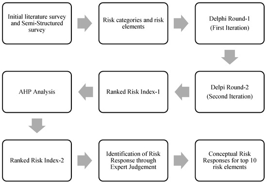 In many developing countries, conventional construction project risk-management practices suffer from an absence of comprehensive risk-management systems and limited attention to proper risk-management techniques [38,39]. This highlights a critical gap that necessitates the development of a tailored risk-assessment framework specifically designed to address the unique challenges faced by HVPTL construction industries in developing nations [15,35]. Such an initiative holds the potential to not only improve project outcomes but also significantly contribute to the sustainable development of CIs in these regions. Accordingly, this study aims to identify and prioritize critical risk factors within the context of HVPTL construction projects utilizing the Delphi survey technique and AHP analysis. The research focuses on the Sri Lankan HVPTL construction sector as a case study to provide valuable insights and recommendations for enhancing risk-management practices in similar settings. The remainder of this paper is organized as follows. Section 2 presents the methodology adopted in this study, detailing the data-collection process, and analysis techniques. In Section 3, the results of the analysis are discussed, highlighting the key findings and their implications. Section 4 provides a detailed discussion of the results in comparison with existing literature, emphasizing the contributions to the field. Finally, Section 5 concludes the paper by summarizing the key insights, outlining the limitations, and suggesting directions for future research.