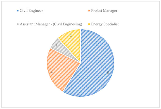 Following the completion of the Delphi survey data collection aimed at prioritizing the most critical risk factors, the analytic hierarchy process (AHP) was adopted for risk-factor prioritization. AHP is a recognized multi-criteria decision-making methodology that facilitates systematic comparisons of alternatives by integrating qualitative and quantitative criteria. This method offers a structured framework, breaking down complex problems into a hierarchical structure of more manageable components. By utilizing AHP, the study sought to ensure a rigorous and systematic approach to prioritizing risk factors, thereby facilitating a more informed and objective decision-making process based on expert evaluations and opinions. In previous studies on multi-criteria decision making (MCDM), the analytic hierarchy process (AHP) has been recognized for its capability to achieve high consistency without requiring a large sample size [59,60,61,62]. As such, the recommended number of participants for AHP analysis typically ranges between 5 and 15 to maintain efficiency and consistency [63,64]. In this study, 16 responses were received, and 12 participants were selected for AHP ranking based on the consistency ratio (CR) to ensure robust and reliable results. A separate questionnaire was used to get input from experts to calculate importance weight (see Appendix E). The work experience of the experts and positions held in the organizations are depicted in Figure 4 and Table 1, respectively.