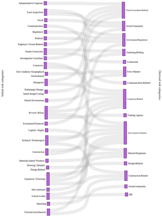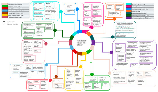 To identify risk elements in the context of HVPTL construction, 14 main risk categories were established based on an initial literature survey. These main risk categories were derived by consolidating the similar risk categories presented in Table 2 from the literature. Figure 5 illustrates the derived risk categories specific to HVPTL construction. Accordingly, client/consultant, design-related, tendering/bidding, contractual, communication, material/equipment, government/regulatory, sub-contractor, contractor-related, natural/environmental, social/community, funding agency, construction, and human resources were considered the main risk categories in the present study. Then, the risk elements were identified under each main risk category through a preliminary survey and the literature review, as elaborated in Figure 6.
