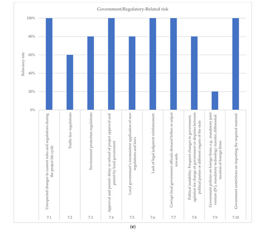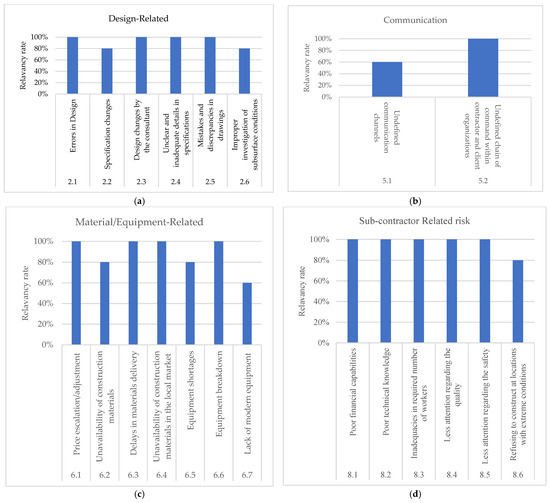Relevance rate for the identified risk elements under each category ((a) Design-Related risk, (b) Communication risk, (c) Material/Equipment-Related, (d) Sub-contractor Related risk, (e) Government/Regulatory-Related risk).