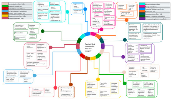 All identified risk elements in the “contractor-related risks”, “natural/environmental risks”, “social/community-related risks”, “funding agency-related risks”, and “human resource-related risks” categories received a 100% relevancy rate. Furthermore, participants proposed two additional risk elements for the “social/community-related risks” category (see Figure 6).