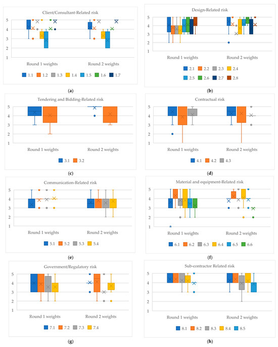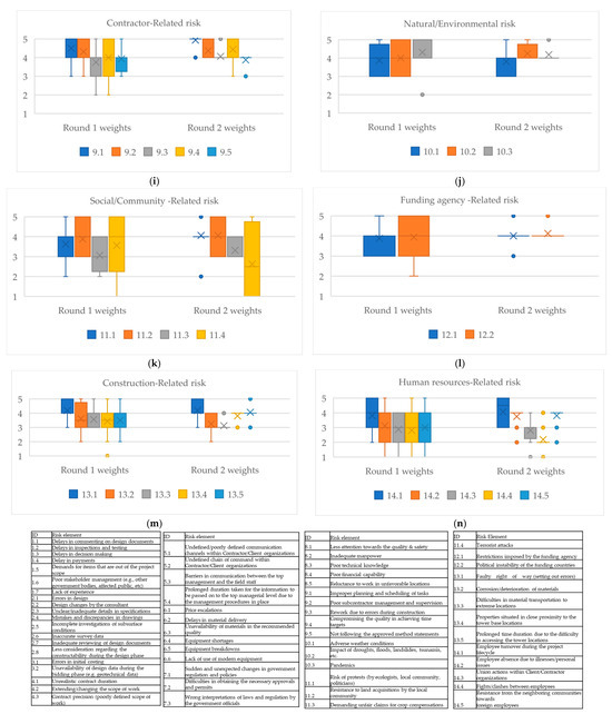 Box and whisker plots of weights assigned by respondents. (1—least critical; 2—less critical; 3—moderately critical; 4—highly critical; 5—extremely critical). ((a) Client/Consultant-Related risk, (b) Design-Related risk, (c) Tendering and Bidding-Related risk, (d) Contractual risk, (e) Communication-Related risk, (f) Material and equipment-Related risk, (g) Government/Regulatory risk, (h) Sub-contractor Related risk, (i) Contractor-Related risk, (j) Natural/Environmental risk, (k) Social/Community-Related risk, (l) Funding agency-Related risk, (m) Construction-Related risk, (n) Human resources-Related risk).