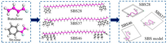 - Li, C.; Fan, S.; Xu, T. Method for evaluating compatibility between SBS modifier and asphalt matrix using molecular dynamics models. J. Mater. Civ. Eng. 2021, 33, 04021207. [Google Scholar] [CrossRef]