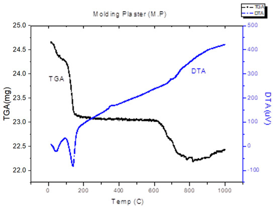 Thermal analysis techniques were employed to investigate the stability properties of raw plaster in greater detail. The analyses were conducted in an atmospheric air environment, spanning a temperature range from ambient to 1000 °C, using a heating rate of 10 °C/min [18]. The obtained TGA (Thermogravimetric Analysis) and DTA (Differential Thermal Analysis) curves for the plaster can be found in Figure 4.