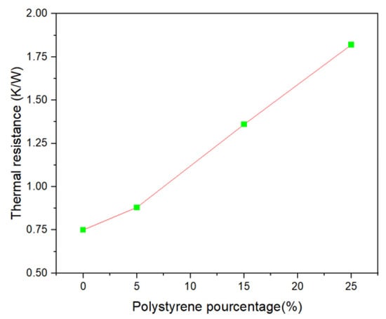 Figure 6 shows how the thermal resistance of the bio-composite material varies with the amount of polystyrene content. Thermal resistance is a measure of a material’s ability to resist the flow of heat through it, and polystyrene content refers to the amount of polystyrene present in the material being studied [25]. The graph shows a curve that represents the variation in thermal resistance with polystyrene content. The x-axis of the graph represents the polystyrene content, while the y-axis represents the thermal resistance. The mathematical relationship between thermal resistance and polystyrene content can be expressed as , where R is the thermal resistance, L is the thickness of the material, k is the thermal conductivity of the material, and A is the area of the material.