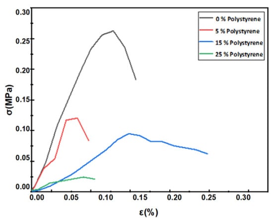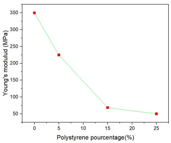 The variation in polystyrene content affects the Young’s modulus, as shown in Figure 8. The modulus decreases with the presence of polystyrene balls, a common outcome in polymer materials [28].