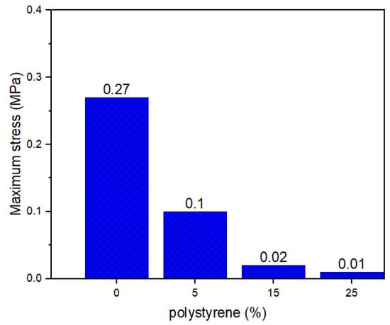Figure 9 demonstrates the effect of polystyrene on the maximum stress a composite material can withstand under compression. This property is critical for determining the material’s strength and durability [29]. The inclusion of plaster in the composite reduces its thermal conductivity and enhances its mechanical properties. Polystyrene’s closed-cell structure restricts heat conduction, and adding plaster improves strength and stiffness.