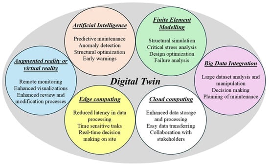 Digital twins (DTs), which are often recognised as virtual replicas of actual structures, play a vital role in this regard due to the harmonic coexistence that they offer between actual and virtual models [6,7]. Such a system could potentially result in assisting in monitoring the structural health of a bridge remotely and for its entire life cycle management. However, the application of DTs is mostly restricted to the design stage of a structure whilst mostly interpreting the geometry, and hence, most of the existing DTs are geometric DTs (such as CAD files) [8]. DTs can be seamlessly integrated with various advanced technologies, such as finite element modelling (FEM), artificial intelligence (AI), or the Internet of Things (IoT). Accordingly, this integration significantly enhances the predictive maintenance of bridges by enabling real-time monitoring, advanced data analysis, and more accurate simulations, ultimately leading to improved structural health management and optimised maintenance strategies [1]. The potential benefits of a DT system can be presented in Figure 1 with different integrated technologies.
