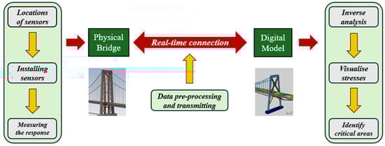 (1) The implemented DT models based on FE modelling have focused on presenting only the deformed shape and stress variations in the structure in real time and identifying the critical locations of the bridge if there is any anomaly in the structural behaviour. However, further extensions can be made to estimate the future state and to suggest suitable maintenance measures for the structure in order to achieve a remote structural health monitoring and maintenance process via DTs.