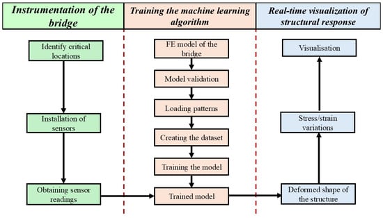 The implementation of a DT of a bridge initiates from installing sensors for data acquisition and continues until the DT model receives the data, conducts an inverse structural analysis and visualises stresses to identify critical areas; see Figure 2. The implementation of the digital model with the help of FE modelling, specifically the integration of finite element modelling (FEM) and artificial intelligence (AI) techniques with the DT concept for that purpose, has been primarily focused on in this paper. DTs with FEM could also result in significant benefits, as the critical stresses can be analysed and visualised in bridge DTs at the same time [9]. Further, to ensure continuous alignment with the actual structure, it is essential to perform the FEM in real time. However, conducting FEM in real time is inherently challenging due to its computational complexity, and it offers the opportunity to explore surrogate models that can replace the time-consuming computational process of FEM whilst reducing its computational burden by simplifying the high-fidelity models without affecting its accuracy. It has been identified that a combination of data-driven methods with a physics-based modelling technique, like FEM, could substantially benefit in simplifying the complexities of the computational process and achieving real-time conditions [10]. Another merit of incorporating a data-driven method arises during the inverse analysis of a structural response upon the received measurements of data acquisition sensors, as such methods enable the inverse analysis in leveraging sensor measurements to enhance the accuracy and reliability of the structural health assessment [11]. However, inverse analysis processes often lead to be presented with challenges of being ill-conditioned [12,13], where the results may be largely deviated even for a small change in inputs. Hence, AI techniques, specifically machine learning (ML) algorithms, have recently been identified as a powerful tool to address these issues and produce a real-time FE model whilst also conducting an inverse analysis process [14,15]. Also, recent advancements in artificial intelligence (AI) have shown significant potential in enhancing structural health management (SHM) processes for existing bridges, including automated visual inspections, sensor-based structural monitoring, and predictive risk assessments. AI techniques, such as machine learning and deep learning, have been applied to improve defect detection, performance analysis, and deterioration prediction, offering promising pathways to optimise bridge assessment and maintenance strategies [16]. The FEM excels at producing highly precise results of analyses, whilst AI or ML algorithms offer the opportunity of reducing the time factor once trained with FEM data and enabling real-time predictions, optimisation, and decision-making for structural health management. Hence, it would be an ideal option to incorporate ML algorithms in surrogating the inverse FEM for the development of DTs for real-time structural health assessment.