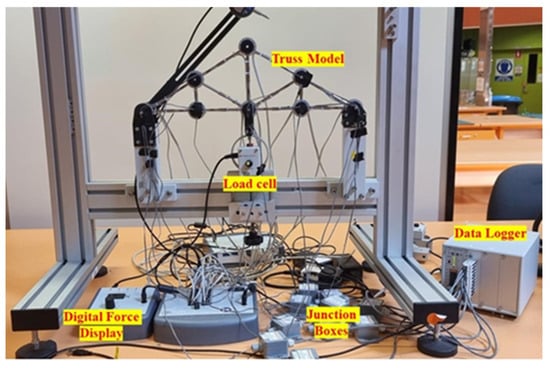 A 2D truss bridge was used in this study to represent the primary load-bearing component of a 3D truss bridge. In a 3D truss bridge, each truss on either side of the bridge supports loads acting solely within its own plane. These loads are transferred to each truss through horizontal beams in the deck, which connect the two trusses and form the complete 3D bridge structure. Hence, a 2D truss acts as a fair representation of a 3D truss bridge. In this study, the STR8 pin-jointed symmetrical truss bridge model, located at RMIT University in Melbourne, Australia, serves as the experimental structure. This truss comprises 13 steel members with circular cross-sections, each having a diameter of 6 mm and a Young’s modulus of approximately 193 GPa; see Figure 4. The truss is supported by a pin at one end and a roller at the other, allowing it to handle applied loads within a range of −500 N (compression) to +500 N (tension). Loads can be applied at any pin joint, with angles reaching up to 45°, and are precisely measured and displayed by integrated load cells within the loading mechanism, ensuring accurate monitoring of applied forces. This setup provides a reliable model for studying load responses in truss structures under varied conditions.