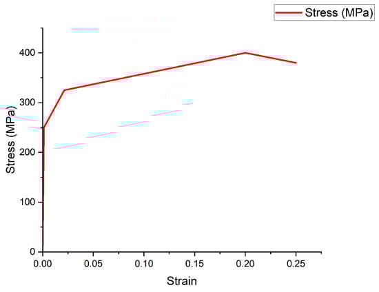 The loading cell positions were chosen to ensure that the uninstrumented members experienced no stress, and these locations were fixed for the duration of the experiment. To optimise sensor placement, the zero-force members within the truss were identified, allowing for a targeted deployment of 10 strain gauges across the selected members (out of a total of 13). These gauges were directly connected to the data acquisition module and for the remaining three members, which include two vertical and one inclined member, strain responses were assumed to be negligible, registering as zero due to their minimal load-bearing roles. Furthermore, the stress–strain behaviour of the material was modelled using the known elastic modulus (193 GPa) of the material and yield and ultimate stress values for structural steel (250 MPa and 400 MPa, respectively) as mentioned in the manufacturer’s guidelines; see Figure 6. Up to 250 MPa, the structure behaves linearly elastic and shows a yield strain of 0.0013. Beyond the yield point, the material undergoes plastic deformation, characterised by a yield plateau and strain hardening, until reaching the ultimate stress of 400 MPa. At this point, the material begins to neck and eventually fractures at a strain of approximately 0.25, indicating a ductile failure.