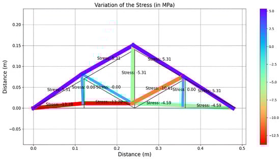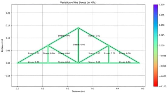 The trained models were then applied to implement the DT model of the laboratory-scaled bridge. The locations of the sensors and the installation are explained in Section 3.1. Sensors were installed in 10 different locations on the bridge, and they came up with the inbuilt software that allows the transfer of the measured strain values to the computer. They were updated as per the sampling rate, and it was set to one second to achieve near real-time conditions. The measured sensor values were then transferred to a Python code, which was applied to the trained model and generated the displacement values as the output of the model. It was assumed that the bridge was acting linearly elastic, and the displacement values were then used to obtain the stress values of each member. Ultimately, the stress variation and the deformed shape of the bridge were displayed on the screen. A snapshot of one instance has been presented in Figure 20. For every instance where the applied load is changing, the stress variation also changes under near real-time conditions.
