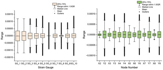 It can be seen that the strain distribution across 10 strain gauge positions and the nodal displacements of all nodes exhibit consistent behaviour, and this is due to the linear elasticity of the structural behaviour. Also, the median values for most positions are also centred around zero. It is further noticeable that outliers are present in both panels, but their number and spread are more significant in certain positions like SG_5 to SG_8 and X5 to X8. These outliers suggest that while the overall behaviour remains consistent, localised peaks or anomalies in strain values exist, which are associated with the geometry, load distribution, or boundary conditions. Further, it can be identified that nodal displacement values are relatively smoother and more consistent when compared to the distribution of strain values. Certain strain gauge locations, i.e., SG_5 to SG_7, exhibit a wider range of strain values, indicating areas of increased deformation or stress, which are likely influenced by the geometry and boundary conditions of the structure. However, that might not depend on the load application point since the location of the load application was randomised for preparing the dataset. Overall, it can be seen that the data behaviour reflects a combination of global structural stability and localised effects, and such an understanding of the dataset is useful for identifying critical regions and ensuring the behaviour of the structure under the modelled conditions.