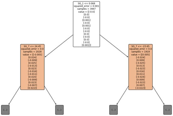 The RF algorithm is recognised as a robust ensemble method that employs numerous independent decision trees, each constructed with added randomness, to improve predictive accuracy and reduce overfitting [38]. This algorithm has shown high effectiveness in various predictive tasks within the civil engineering domain, particularly for handling complex and non-linear relationships [39,40]. In this study, the RF model was configured with 100 estimators, ensuring an ensemble with sufficient depth to capture the data patterns accurately. To promote consistency and reproducibility, a random state was set, which controls the randomness in data sampling and feature selection. Additionally, a 5-fold cross-validation was applied to provide a reliable evaluation of the model’s performance across different data splits, with root mean square error (RMSE) selected as the metric to assess prediction accuracy. This approach helps to mitigate overfitting, enabling the model to generalise well on unseen data. Moreover, the RF’s inherent feature importance ranking offers valuable insights into the influence of each input variable, contributing to improved interpretability of the model’s decisions. These parameters collectively enhance the reliability and robustness of the RF model for inverse structural modelling tasks. The first two levels of one decision tree of the developed RF model are presented in Figure 9. SG refers to the strain gauges that are mentioned in Figure 5. The values were decided by the RF algorithm automatically for the decisions. As can be seen in Figure 5, the topmost node or the root node of the decision tree splits the data based on the condition SG_1 ≤ 0.068, the squared error before the split is 0.001, and the total number of samples, which, considered at this node, is 3947. The ‘value’ term represents the predicted values of the model, which are, in this case, the displacement values of each node. Then, the two child nodes are presented, and they check certain conditions for SG_7. Likewise, this continues to predict output for a certain set of sensor readings, and the grey boxes indicate that in third level.