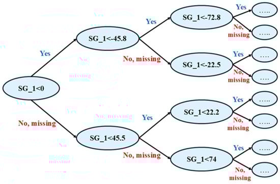 The XGBoost algorithm is a widely used gradient-boosting technique known for its speed and predictive power, making it popular in a variety of machine learning applications. In civil engineering, it has successfully addressed several predictive tasks [47,48]. For this study, XGBoost was developed with a focus on optimising the hyperparameters to maximise accuracy. The hyperparameters were optimised using Bayesian optimisation with a tree-structured Parzen estimator (TPE) algorithm [61]. The objective function was defined to minimise the mean squared error (MSE) over a maximum of 100 evaluations. The selected settings included a maximum tree depth of 7, a min_child_weight of 4, a learning rate of 0.1, and 100 estimators. Additionally, colsample_bytree was set to 0.52, and L1 and L2 regularisation were applied to control model complexity. A 5-fold cross-validation scheme assessed the model’s robustness using root mean squared error (RMSE) as the evaluation metric. Hyperparameter tuning was performed via Bayesian optimisation, which iteratively searched for optimal settings to minimise the validation error. The final model was trained on the complete training data, while early stopping helped prevent overfitting by halting training once performance ceased to improve. The first few stages of one decision tree of the developed XGBoost algorithm are shown in Figure 10. SG refers to the strain gauges that are presented in Figure 5, and the values have been decided by the XGBoost algorithm automatically. It shows the prediction of the target variable based on the input feature SG_1. The tree splits the data sequentially at various threshold values of SG_1, creating decision boundaries to minimise the prediction error at each level. It further demonstrates how the model identifies optimal thresholds for the feature SG_1 to segment the input space and predict the target variable. It also highlights the tree’s capability to handle missing values, as indicated by the “No, missing” branches.