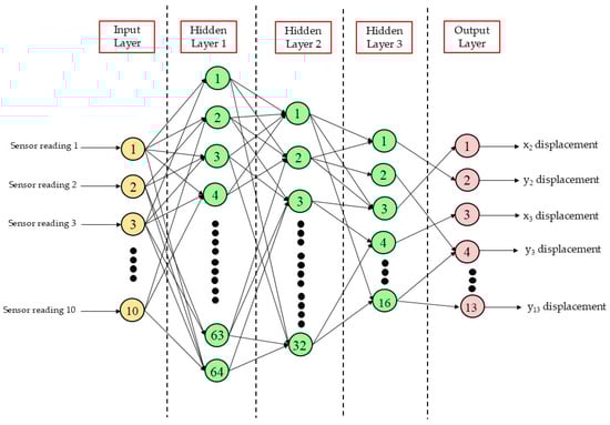 MLP neural networks are among the most widely used neural network architectures, particularly due to their straightforward, fully connected structure as feedforward ANNs. An MLP typically includes three or more layers: an input layer, one or more hidden layers, and an output layer. The interconnected nodes across these layers enable effective predictive capabilities, and MLPs have shown notable success as surrogates for finite element (FE) models [15,59]. In this study, min–max scaling was applied to normalise the data, promoting faster convergence during the training of the MLP. The tested MLP architecture was implemented using Keras and consisted of four layers, including three hidden layers. The input layer received ten features, while the hidden layers contained 64, 32, and 16 units, respectively. The output layer was defined with 13 units, accounting for the constraints applied to three nodes in the modelled structure. ReLU was used as the activation function to handle non-linearity, and the model’s parameters were optimised using the Adam optimiser. RMSE was employed as the loss metric to gauge performance. Training was conducted over 200 epochs with a batch size of 32, and early stopping was implemented to prevent overfitting. The architecture of the used MLP model is presented in Figure 11. Table 3 also provides an overview of the hyperparameters of each model.