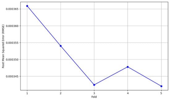 The RF model was developed for the laboratory-scale bridge model, as explained in Section 3.4, and was subsequently trained using a cross-validation approach. The variations in the RMSE values over the five folds are presented in Figure 12.