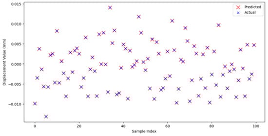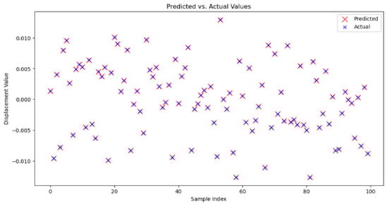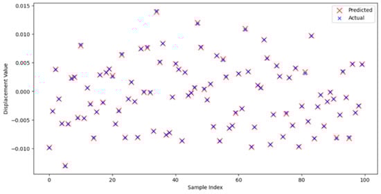 It is noticeable from Figure 12 that the RMSE values across the five folds are relatively close to each other (changing between 0.000342 and 0.00036), confirming the consistency of the performance of the model across different subsets of the data. Also, it confirms that the model has a high generalisation capacity. However, a noticeable drop can be observed from fold 1 to fold 3, where the RMSE values reach the lowest point (0.000342) and again slightly increased in fold 4 and again reduced in fold 5 to a relatively similar value that was observed in fold 3. The reason for these changes would be due to the different distribution of data among different folds. Then, the trained model was tested using a randomly selected dataset. Figure 13 shows the comparison between the predicted data and the actual data for node number 2’s x displacement for 100 testing samples. It can be clearly seen that both the predicted and actual data are highly similar, and overall, the model demonstrated excellent performance.