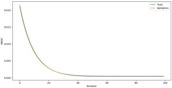 Similarly, the XGBoost algorithm was also tested on the bridge. It ended up with an error of 0.00051. The variations in the error with each iteration are presented in Figure 14. It can be observed that the RMSE for both training and validation datasets decreased rapidly in the initial iterations and flattened out around the 40th iteration. Further training beyond the 40th iteration resulted in minimal improvements and the model has been further converged. Hence, it is noticeable that the model has learned primary patterns in the data early in the training process. Also, the RMSE values of training and validation have been reduced, showing a minimal gap between them, confirming that the model is not overfitting and generalised well for unseen data. When comparing it with the RF model, the XGBoost algorithm for this bridge showed a higher error. However, since this model also showed a significantly lower error when compared with the actual output data, it can be concluded that the performance of the model is acceptable. Figure 15 further illustrates the comparison between the predicted data and the actual data for node number 2’s x displacement for 100 testing samples. It is evident that the predicted values closely align with the actual values, indicating that the model performed exceptionally well overall.